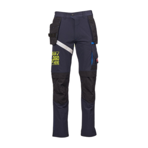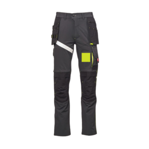 2 bande reflex, ampie tasche anteriori, doppia tasca posteriore di cui una con pattina, chiuse con velcro, passante portamartello, tasca portametro