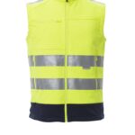 Gilet ergonomico da uomo bicolore in alta visibilità con bande 3M, zip lunga SBS nastrata, due tasche laterali con zip, una tasca al petto, porta badge staccabile e richiudibile. WP 8000 mm H2O, WVT 5000 g/m² 24h.