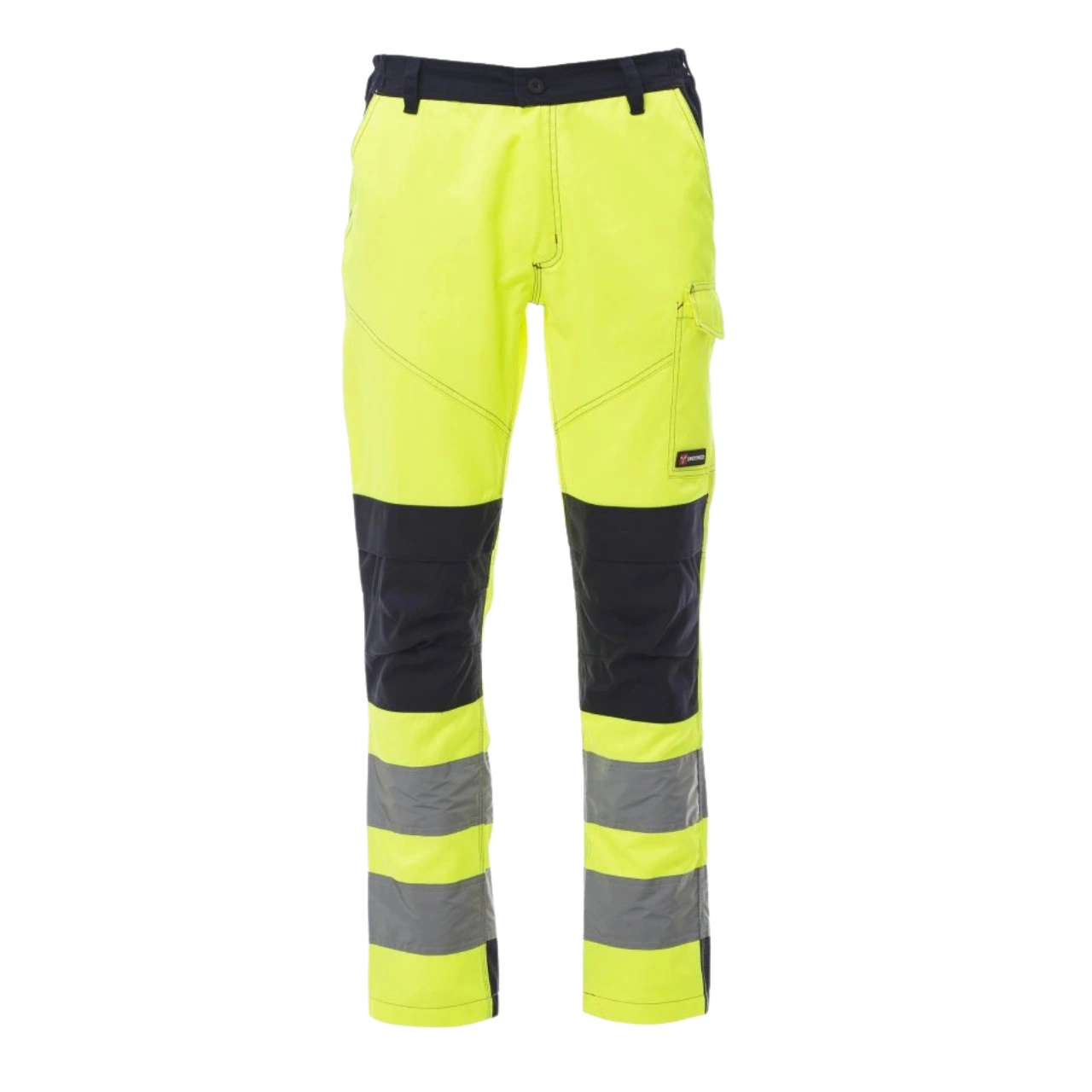 Pantalone uomo con portaginocchiere, multistagione, in alta visibilità con bande riflettenti, elastici laterali e passanti in vita, chiusura con zip e bottone in plastica, due tasche anteriori a taglio classico, tasca laterale LOCK SYSTEM, portametro, porta smartphone, due tasche posteriori di cui una aperta e con bande retroriflettenti e una chiusa con patta e strappo. Cuciture a contrasto, cavallo e interno gamba a triplo ago.