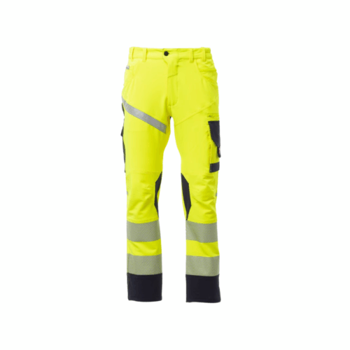 Pantalone unisex, “4 way stretch”, multistagione, in alta visibilità, con elastici laterali e passanti in vita, chiusura con zip e bottone personalizzato. Sul davanti ha due tasche arrotondate, un taschino portamonete a destra, un taschino di sicurezza chiuso con zip a sinistra. Sul fronte della gamba sinistra presenta 3 tasche: una tasca orizzontale chiusa da una zip, una tasca con patta sagomata con chiusura a strappo, dotata di portabadge, una tasca piccola verticale chiusa con zip. Sul fronte della gamba destra è presente una banda retroriflettente. Sul retro sono presenti: una tasca con patta e chiusura a strappo, un anello portamartello, una tasca aperta portametro e una tasca porta smartphone con patta e strappo (gamba destra); una tasca aperta con due bande retroriflettenti (gamba sinistra); inserti retroriflettenti all’altezza delle ginocchia e battitacco in tessuto a contrasto per entrambe le gambe. Bande retroriflettenti segmentate e termosaldate, per agevolare i movimenti. Impunture laterali e travette di rinforzo a contrasto in vari punti.