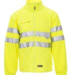 Pile uomo in alta visibilità con bande 3M, zip intera in plastica, coulisse regolabile in vita, elastici stringi polso, due tasche con zip, una tasca frontale con zip e porta badge staccabile e richiudibile, cuciture rinforzate.