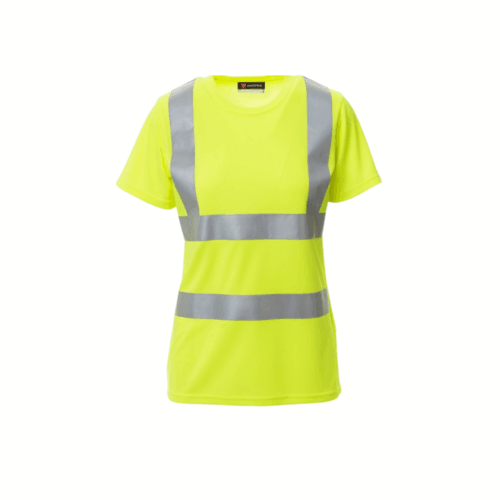 T-shirts girocollo da donna, manica corta in alta visibilità con bande riflettenti, cuciture del collo coperte.