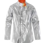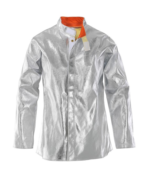 Giacca in tessuto di fibra aramidica alluminizzata 450 g/m², chiusura centrale con velcro e bottoni automatici rivestiti esternamente in tessuto aramidico alluminizzato, collo alla coreana. Cuciture tutte in filato di kevlar 50/3. Protezione per avvicinamento a fonti di calore, da brevi contatti con le fiamme e per i seguenti tipi di calore: convettivo, radiante, spruzzi di alluminio, spruzzi di ferro fuso, attività di saldatura e processi collegati con rischi equivalenti.