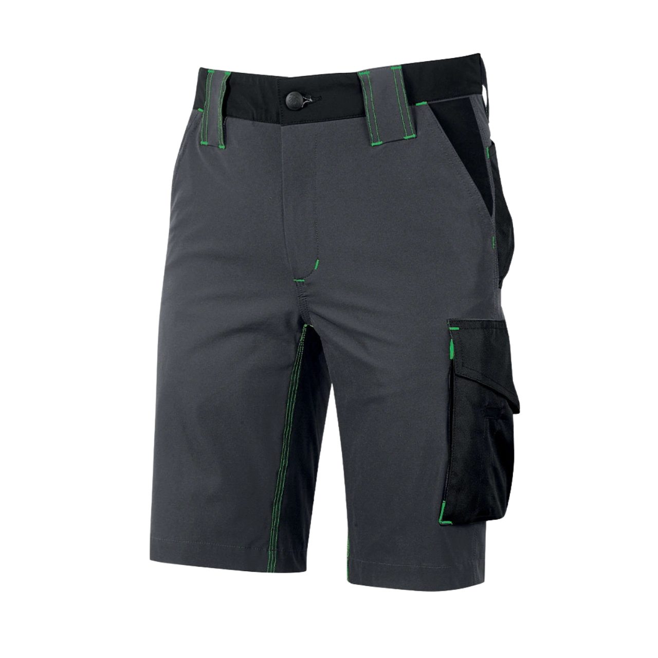 Bermuda in tessuto U-4 (U-Power 4 way stretch) molto comodo, resistente, morbido sulla pelle, idrorepellente, traspirante e asciuga rapidamente. Dotato di due ampie tasche anteriori, elastico in vita con un sistema innovativo di regolazione a scomparsa. Chiusura centrale con zip YKK e bottone gommato antigraffio. Carrè posteriore accentuato per una maggior protezione della parte lombare e nastro reflex su passante tubolare posteriore. Tasca laterale porta utensili, multifunzionale con porta badge a scomparsa, due tasche posteriori di cui una con pattina e una con chiusura di sicurezza a velcro. Due tasche, chiuse con zip in corrispondenza del tascone laterale e della tasca frontale destra. Triple cuciture, Slim Fit.