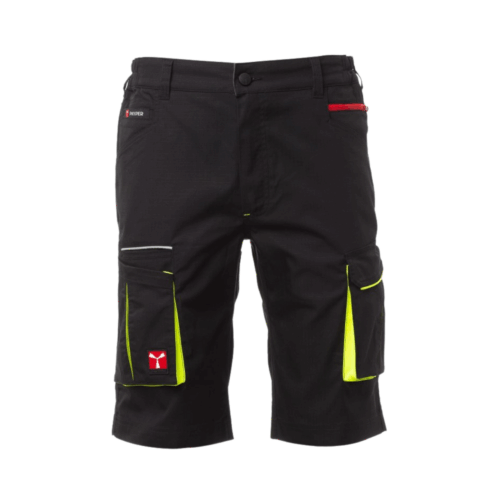 Bermuda unisex, stretch, con elastici laterali e passanti in vita, chiusura con zip e bottone personalizzato. Sul davanti ha due tasche sagomate, un taschino portamonete a destra, un taschino di sicurezza chiuso con zip a sinistra. Sul fronte della gamba sinistra presenta una tasca con soffietto, patta con chiusura a strappo e porta badge. Sul fronte della gamba destra sono presenti: un taschino porta smartphone con bordino retroriflettente e una tasca con soffietto. Sul retro sono presenti: una tasca con patta e chiusura a strappo, una tasca portametro (gamba destra); una tasca aperta con due bande retroriflettenti (gamba sinistra). Cuciture a tre aghi su cavallo, interno ed esterno gamba. Travette di rinforzo a contrasto in vari punti. Le taglie (italiane) centrali 48-50-52 hanno un interno gamba di 31cm.