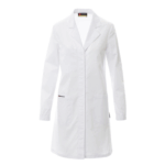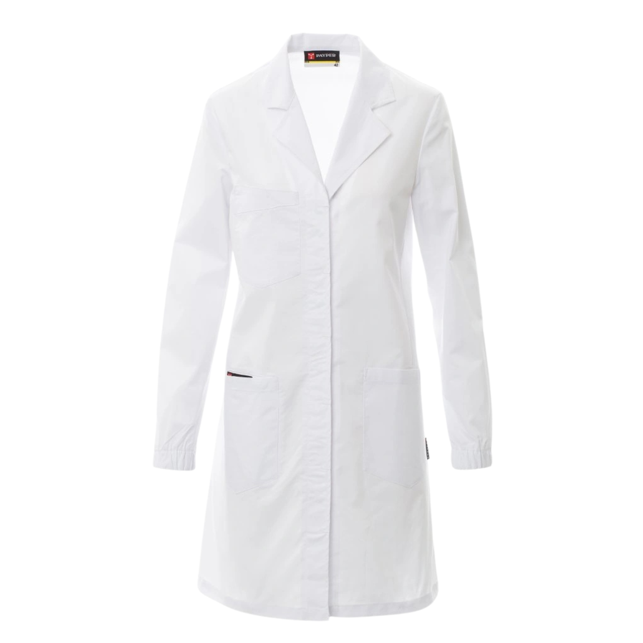 Camice da donna, con collo rever classico, chiuso sul davanti con bottoni automatici, abbottonatura coperta, una tasca applicata sul petto con scomparto porta-penna, due tasche applicate alla vita, un taschino per smartphone, carrè schiena liscio, spacco sul retro per agevolare i movimenti, maniche lunghe con elastici stringi polso.