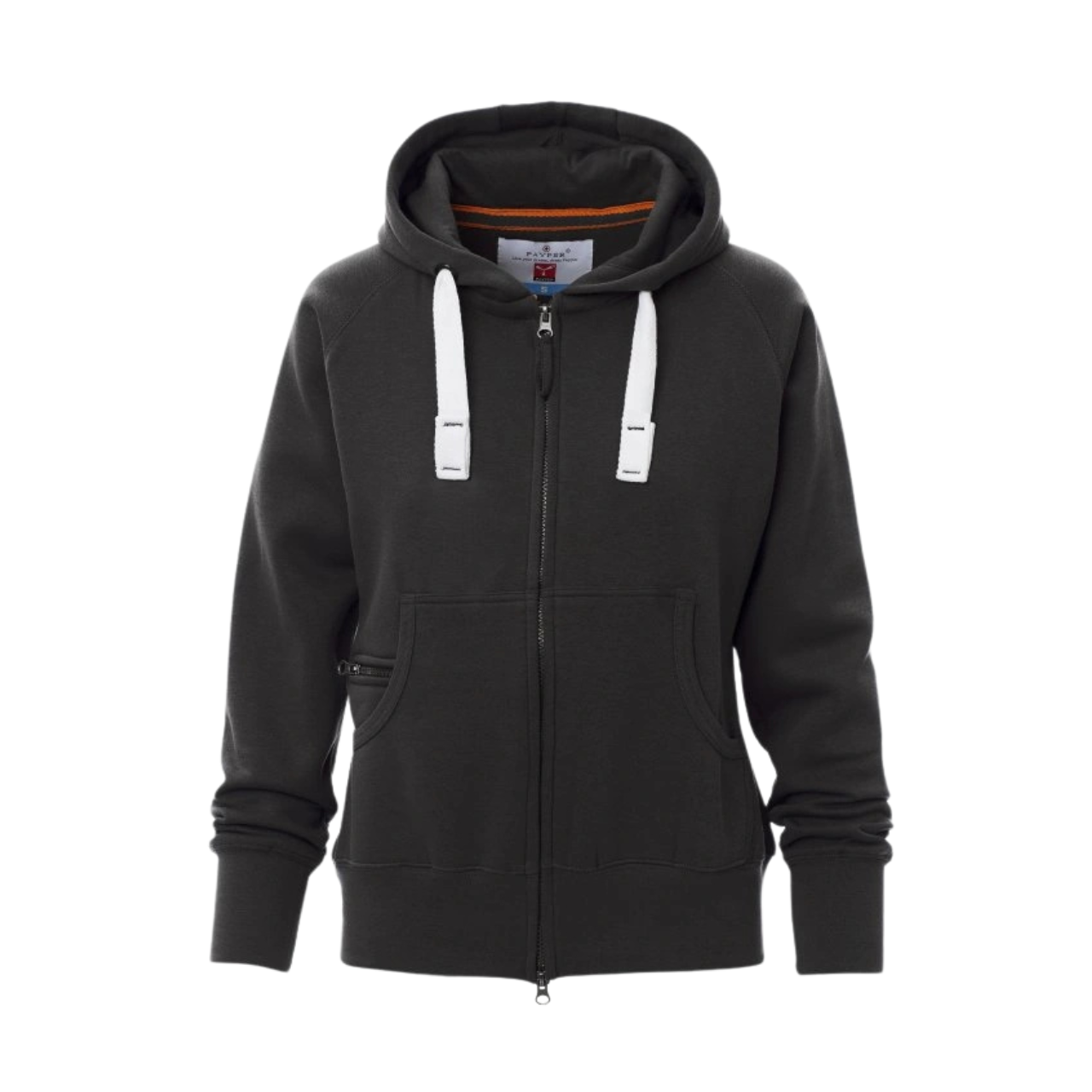 Felpa sfiancata da donna, zip intera SBS coperta, in plastica con doppio cursore in metallo, cappuccio con due cuciture, coulisse bianca in corda con cuciture in tinta con la felpa e anelle in metallo, manica raglan, tasche a marsupio con taschino zip, polsini e vita in costina elasticizzata. Cuciture rinforzate.