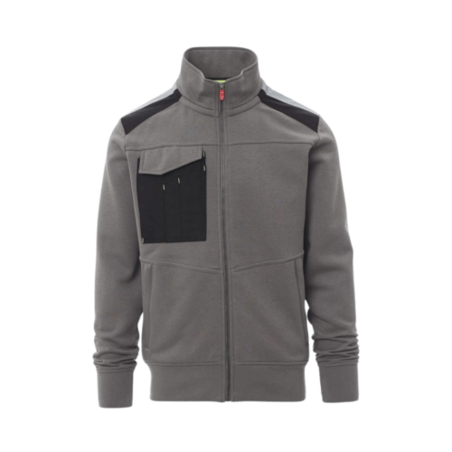 Felpa da uomo, zip intera SBS in plastica con cursore in metallo “semi-autolock”, due tasche con cerniera, una tasca multifunzione al petto con porta badge a scomparsa e patta di chiusura LOCK SYSTEM, bande riflettenti alle spalle, polsini e vita in costina elasticizzata, doppia cucitura al collo, alle maniche e in vita e nastro di rinforzo al collo. Trattamento del tessuto water repellent.