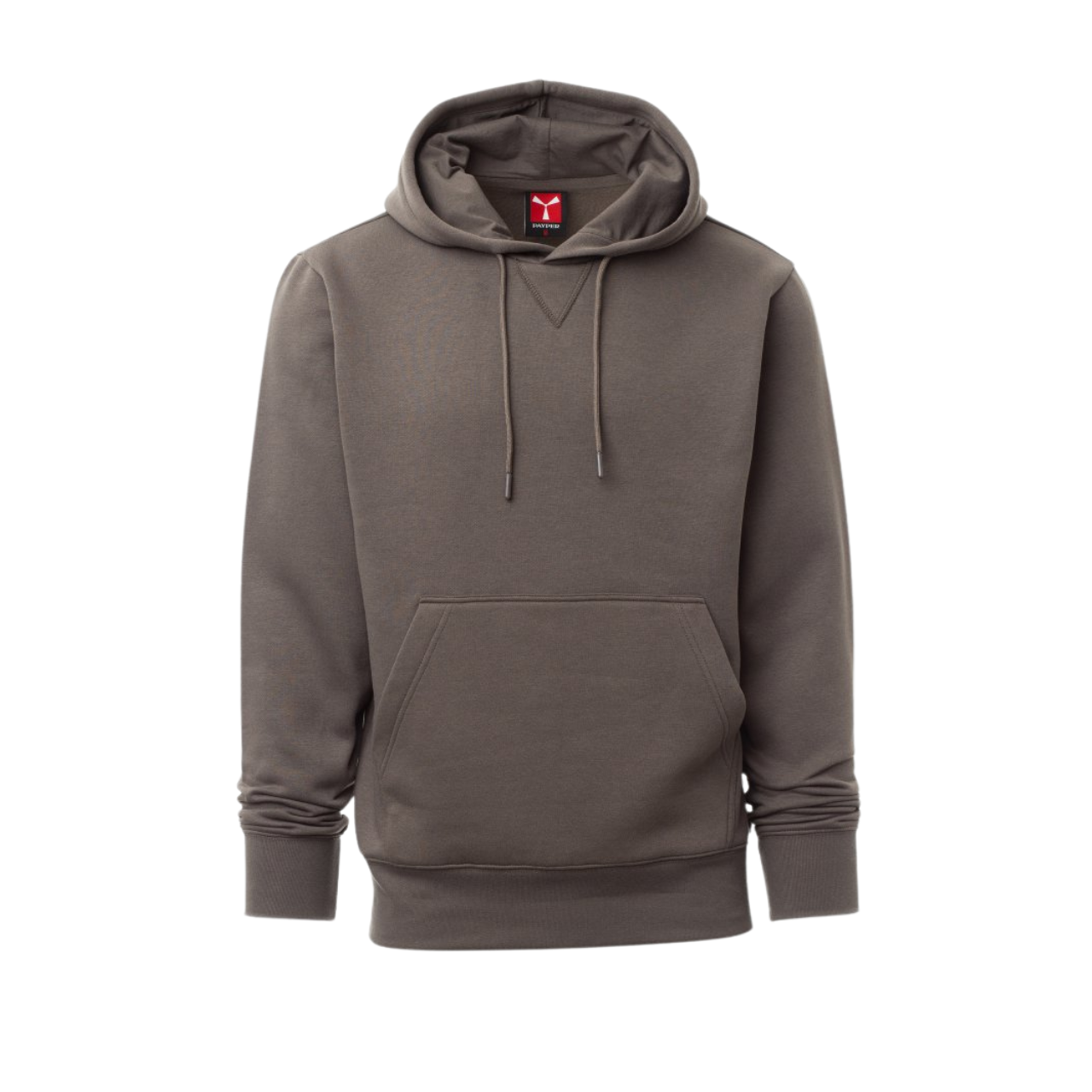 Felpa da uomo, cappuccio con coulisse in tinta, cucitura estetica a V al collo, tasche a marsupio, manica a giro, polsini e vita in costina elasticizzata, cuciture rinforzate. Nastro di rinforzo interno collo in tinta.