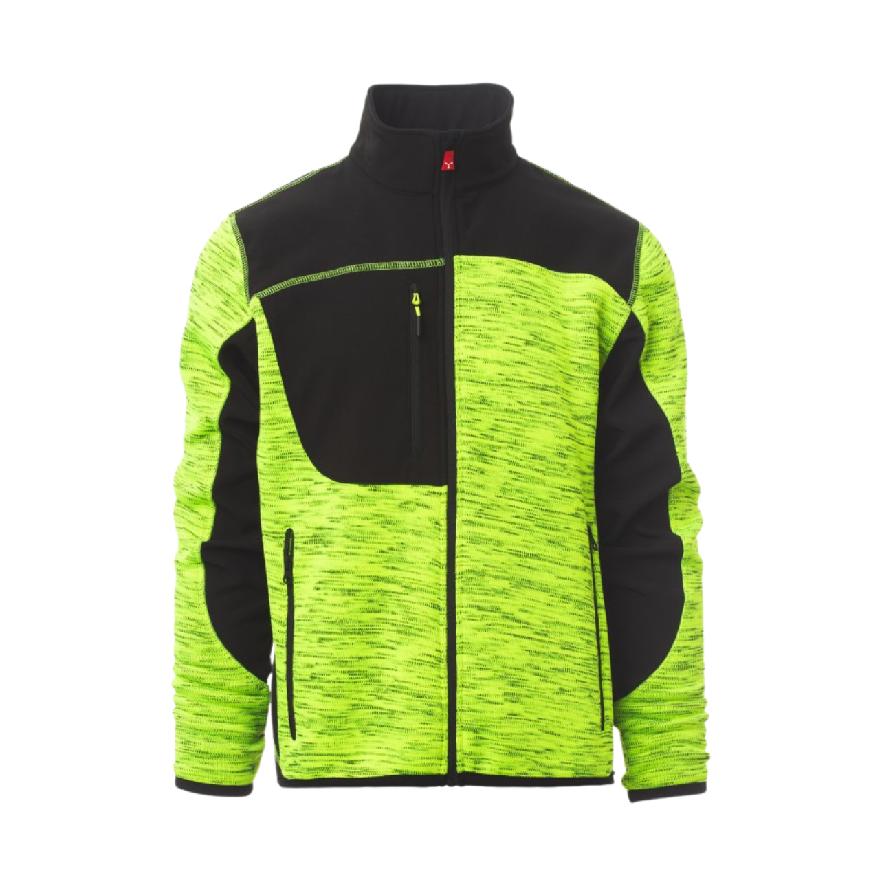 Maglia tecnica con inserti in soft-shell a contrasto, chiusura con zip nastrata, dotata di cursore “semi-autolock” e tiretto personalizzato. Bordino rifinito su polsini e fondo. 2 tasche laterali con zip, 1 tasca al petto sagomata con zip. Dettaglio reflex sul retro.