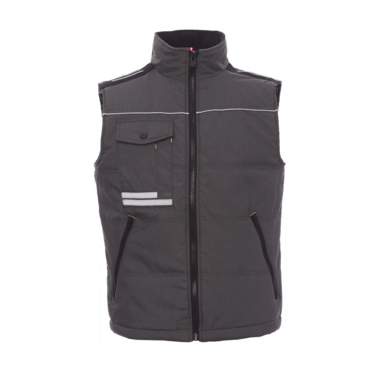 Gilet unisex, zip 8mm in plastica con cursore in metallo, retro sagomato, due ampie tasche esterne con zip, ampia tasca al petto multifunzione, porta smartphone e bande riflettenti, anello porta badge. Interno: imbottitura trapuntata e rifinita con fodera ad alta densità, interno colletto in pile, una tasca.