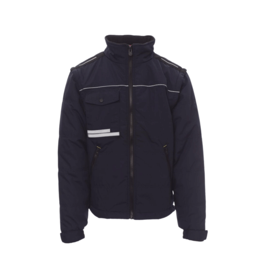 Giubbotto da uomo, maniche staccabili, retro sagomato, zip da 8 mm in plastica con cursore in metallo, con cappuccio a scomparsa, due ampie tasche esterne con zip, ampia tasca al petto multifunzione e porta smartphone con bande riflettenti, anello porta badge. Interno: imbottitura trapuntata e rifinito con fodera ad alta densità, interno colletto in pile, una tasca.