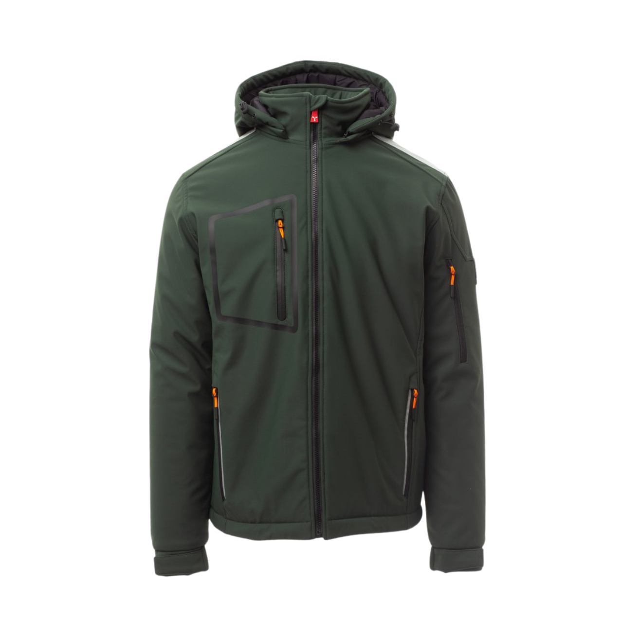 Soft-shell 3 strati, dalla calda imbottitura (160g/m²), da uomo, collo con inserti in pile, chiusura tramite zip SBS con cursore in metallo “semi-auto lock” e tiretto personalizzato. Cappuccio removibile, con coulisse regolabile. Colletto interno con dettagli laterali in pile. Bande retroriflettente su spalle, fondoschiena e retro cappuccio. Polsini elasticizzati, regolabili con strappo e manicotto interno. Tasca termosaldata sul petto, chiusa con zip spalmata. Due tasche laterali, chiuse con zip dal dettaglio retroriflettente. Tasca sul braccio sinistro con porta penne integrato, chiusa con zip. Tiretti fluorescenti. Due tasche interne, di cui una sagomata con zip sul petto destro ed una porta tablet con chiusura a strappo a sinistra. Fondo regolabile con stopper personalizzati. WP 8000 mm H2O, WVT 5000 g/m² 24h.