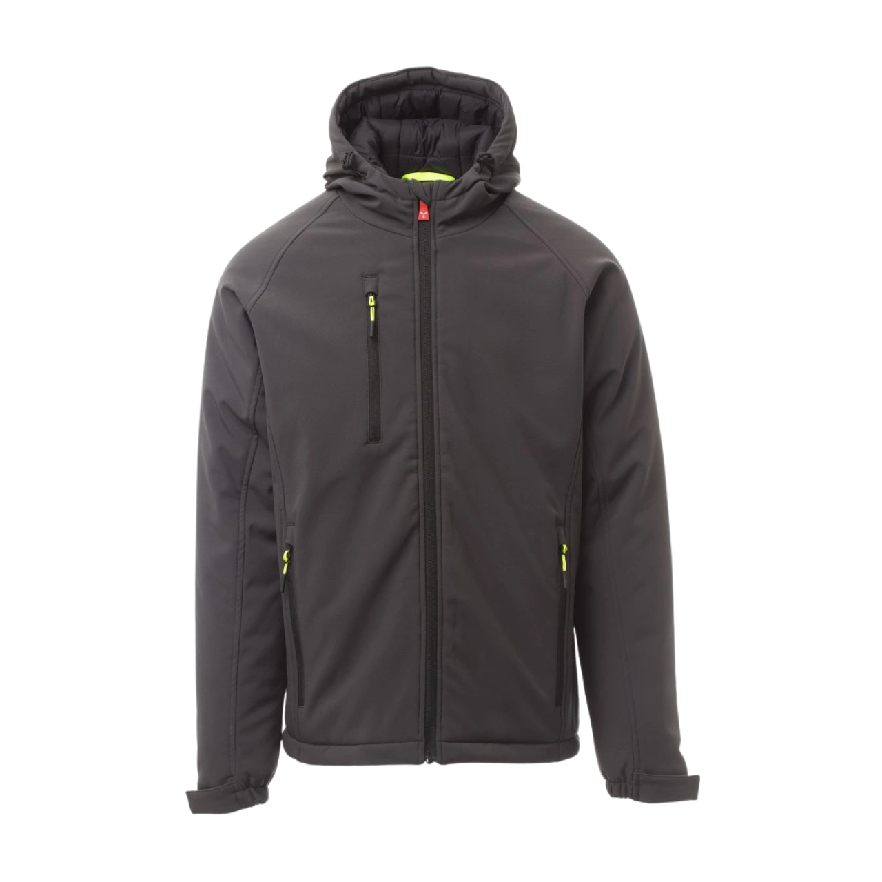 Soft-shell 3 strati, dalla calda imbottitura (160g/m²), da uomo, chiusura tramite zip con cursore in metallo “semi-auto lock” e tiretto personalizzato. Cappuccio fisso con coulisse regolabile. Polsini elasticizzati, regolabili con strappo. Due tasche laterali e una tasca al petto, chiuse con zip. Tiretti fluorescenti. Due tasche interne, una sagomata con zip e una porta tablet con chiusura a strappo. Fondo regolabile con stopper personalizzati. WP 8000 mm H2O, WVT 5000 g/m² 24h.