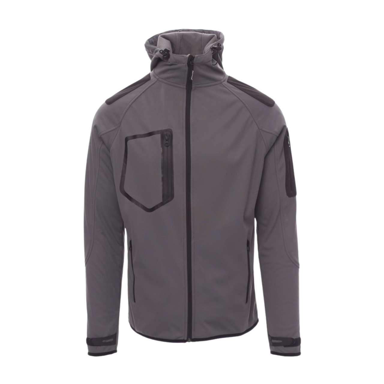 Soft-shell 3 strati, da uomo, manica raglan, chiusura tramite zip SBS nastrata. Cappuccio sagomato con due cuciture e coulisse regolabile con stopper. Polsini regolabili con stringi polso gommati e strappo. Fine bordino su polsini e vita. Due tasche laterali con zip, una tasca al petto termosaldata e una tasca sul braccio sinistro con zip a vista. WP 8000 mm H2O, WVT 5000 g/m² 24h.