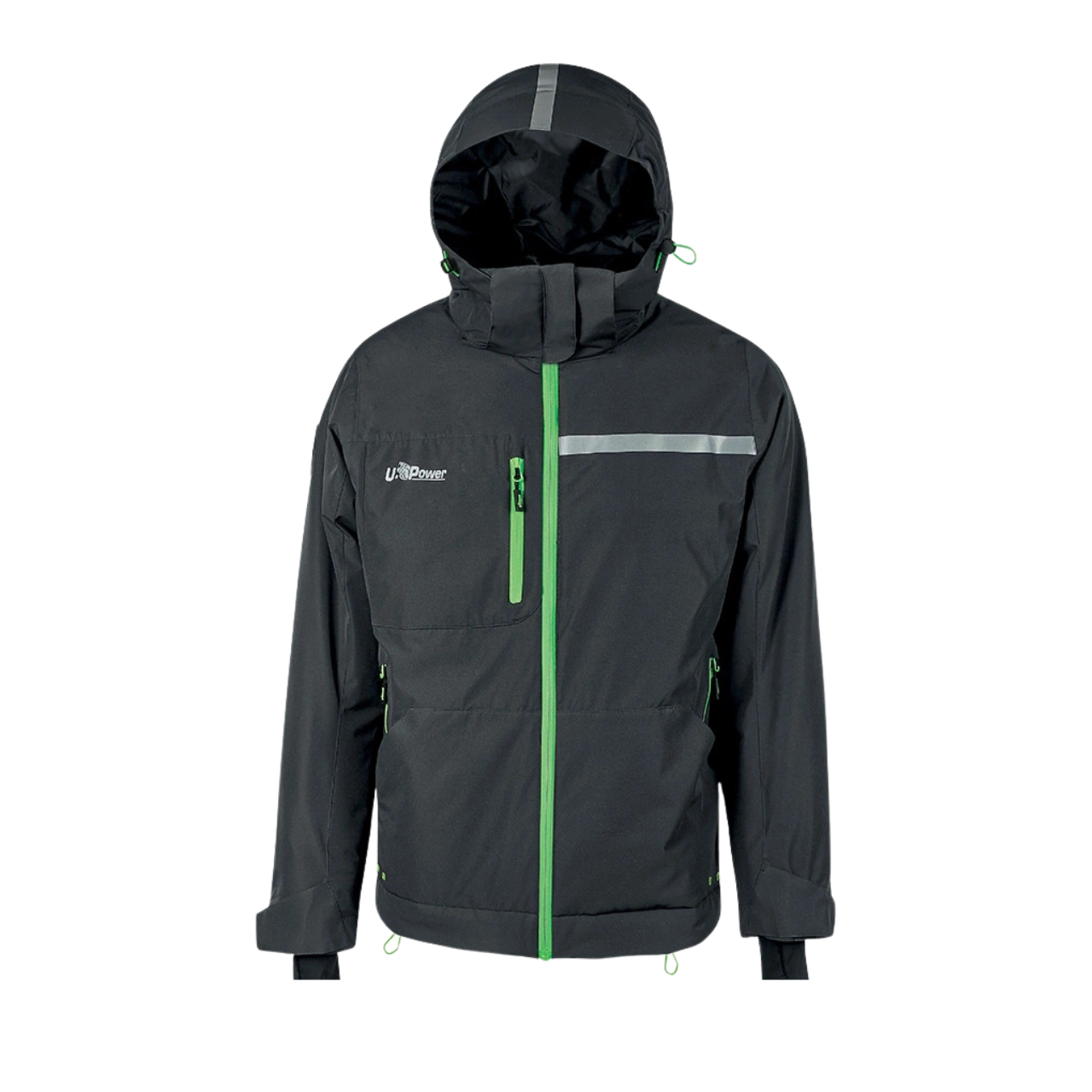 Il design di questa giacca tecnica da lavoro è arricchito dalla presenza di una banda reflex sul petto lato sinistro e sul cappuccio, nelle varianti Asphalt Grey e Dark Green, mentre nella variante Black Carbon le bande hanno un effetto carbonio. Stampa logo reflective “U-Power” sul lato destro del petto e stampa “U-Supremacy” sulla schiena.