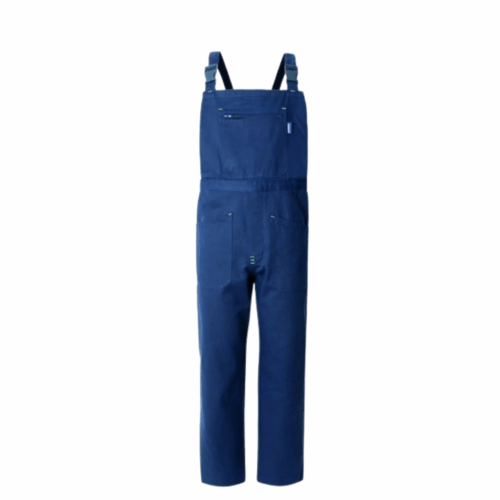 Pettorina da lavoro con fibbie in plastica, un tascone applicato chiuso con cerniera, apertura laterale chiusa con bottone e chiusura della patta con bottoni.