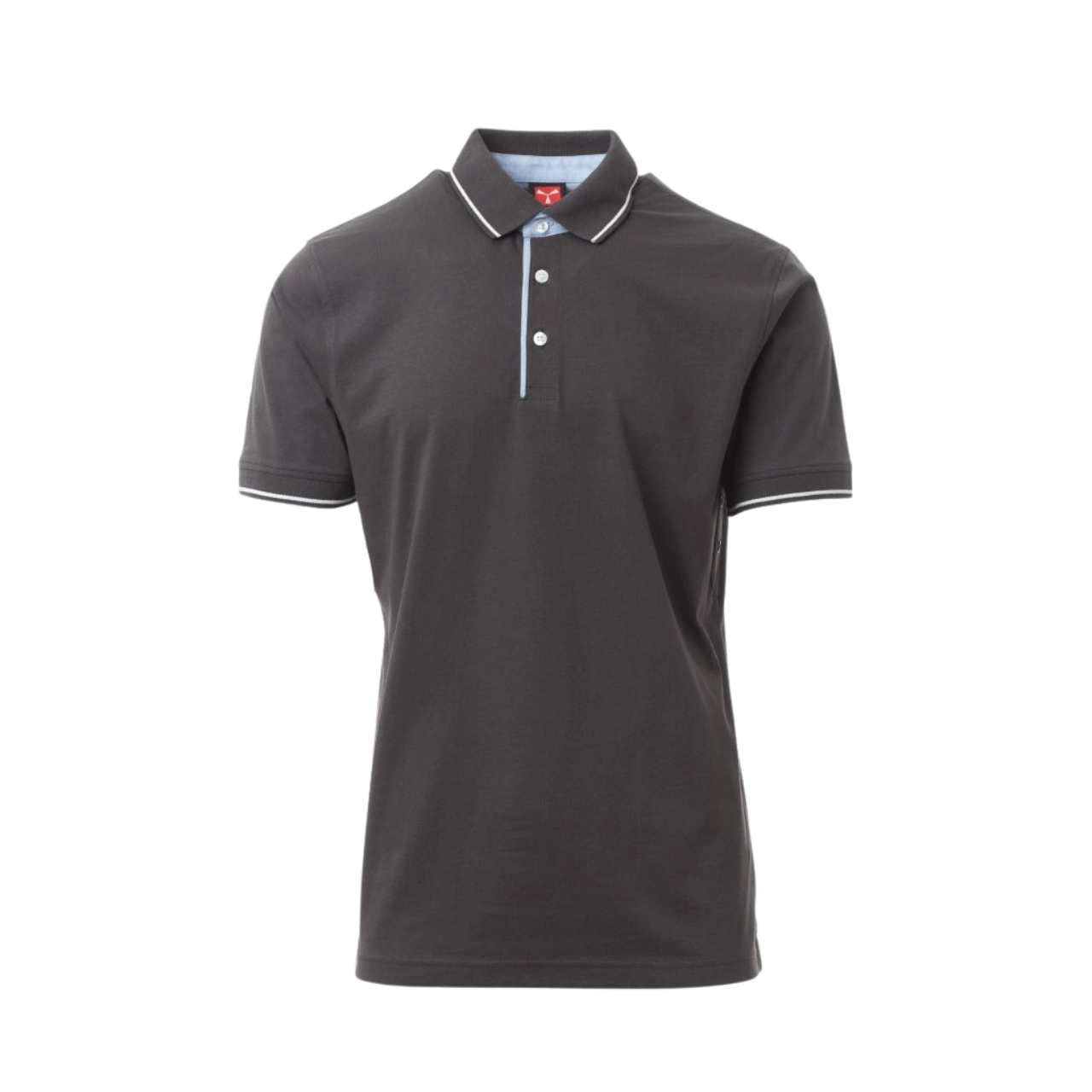Polo da uomo a manica corta a tre bottoni bianchi, con interno collo, patta e spacchetti laterali in oxford celeste, colletto e bordo manica in rib con fine profilo a contrasto, occhielli sotto braccio, spacchetti laterali con cucitura di rinforzo, nastro di rinforzo laterale, cuciture stretch, rinforzo sagomato retrocollo