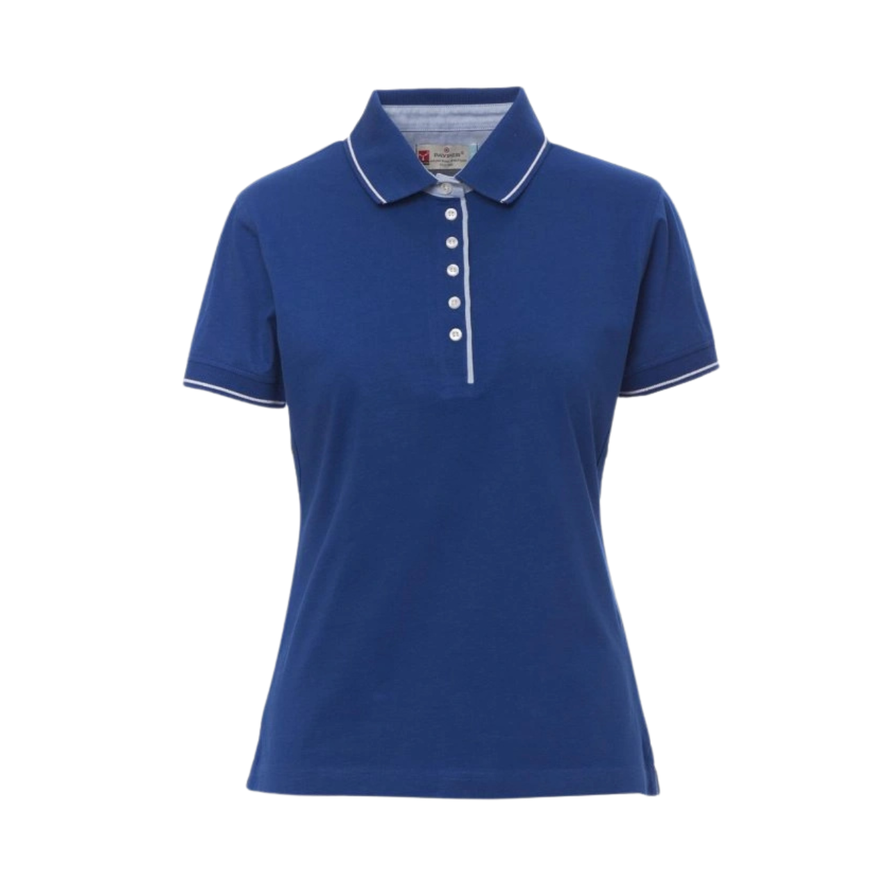 Polo donna sfiancata a manica corta a sei bottoni bianchi con interno collo, patta e spacchetti laterali in oxford celeste, colletto e bordo manica in rib con fine profilo a contrasto, occhielli sotto braccio, spacchetti laterali con cucitura di rinforzo, nastro di rinforzo laterale, cuciture stretch, rinforzo sagomato retrocollo