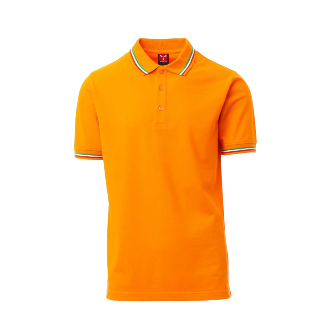 Polo unisex a manica corta a 3 bottoni in tinta, collo e bordo manica con fine profilo tricolore in contrasto, colletto e bordo manica a costine, spacchetti laterali con cucitura di rinforzo, cuciture del collo coperte, nastro di rinforzo laterale, cuciture stretch, rinforzo sagomato retro collo.