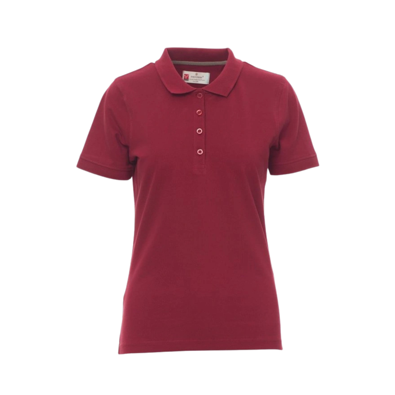 Polo sfiancata da donna a manica corta con 4 bottoni in tinta effetto perlato, colletto e bordo manica a costine, spacchetti laterali, cuciture del collo coperte con nastro a contrasto, cuciture stretch, nastro di rinforzo laterale, rinforzo sagomato retro collo.
