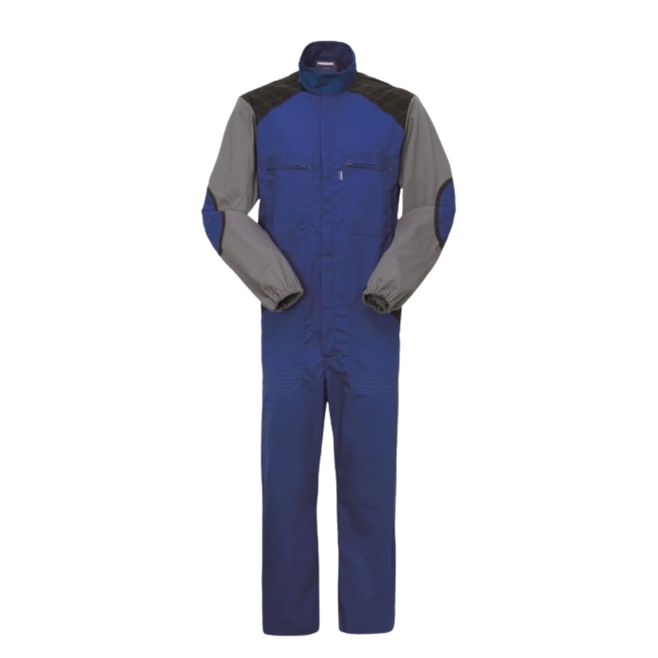 Tuta da lavoro con chiusura con cerniera centrale coperta, collo alla coreana chiuso con velcro.