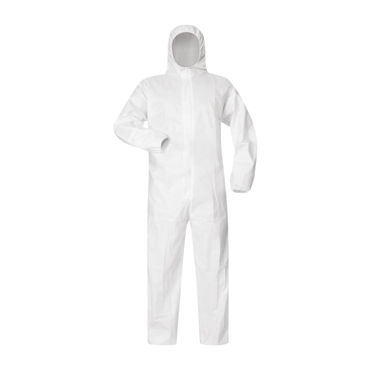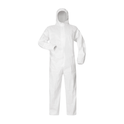Tuta di protezione monouso in tessuto-non-tessuto bianco con laminazione esterna bianca. Cappuccio con estremità elasticizzata, elastici stringipolso, passanti elastici per pollici, stringicaviglia e stringivita. Chiusura a cerniera coperta da pattella adesiva, zip in plastica e tirante in metallo.